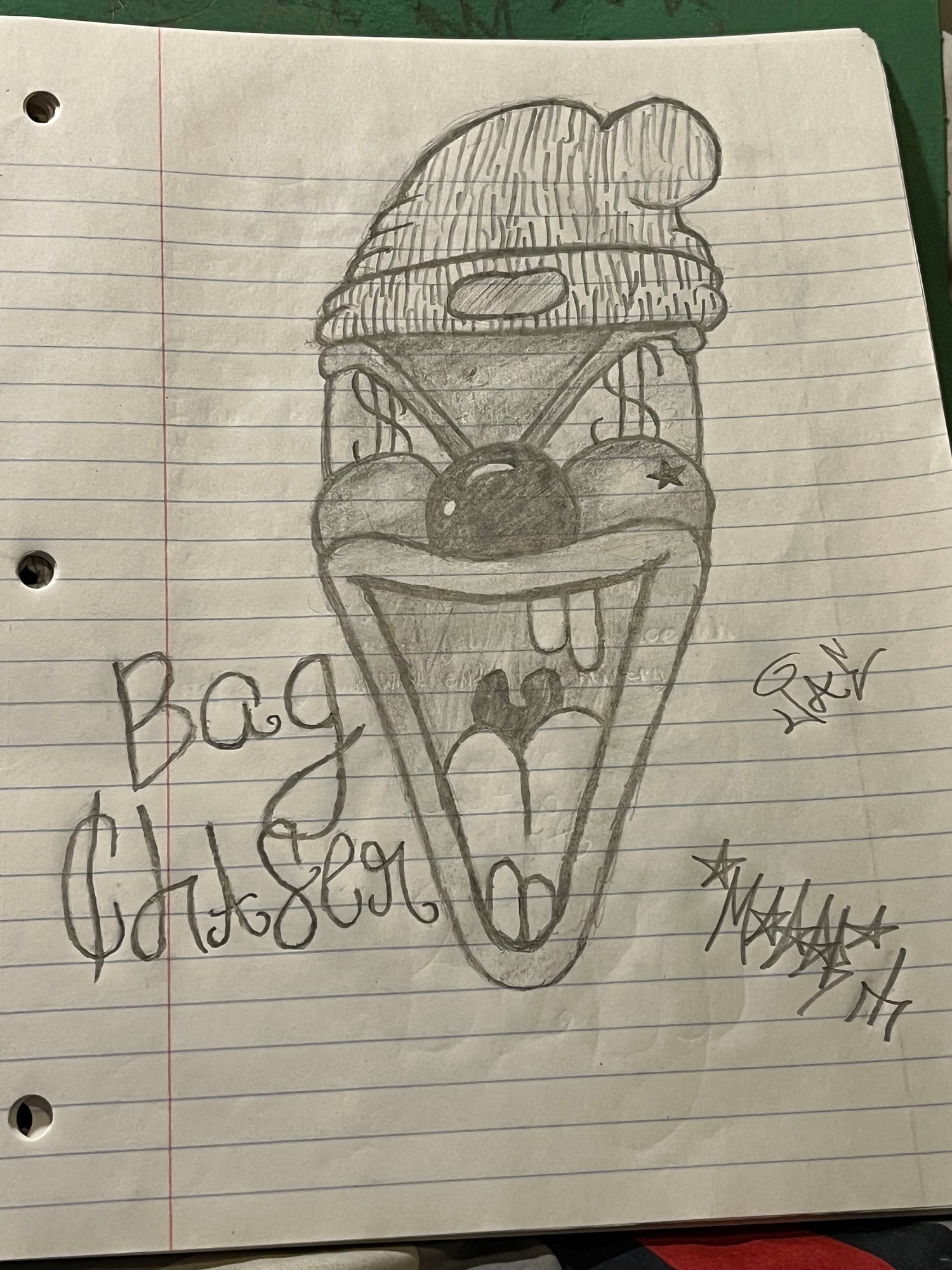 “BC The Clown” is a detailed hand-drawn sketch made during the artist’s time in jail. The piece features bold lines, expressive shading, and a playful yet intense character design that captures a unique street-art style and creative edge. The artwork reflects raw creativity and originality, bringing together humor and grit in a striking visual form that stands out in any collection.
