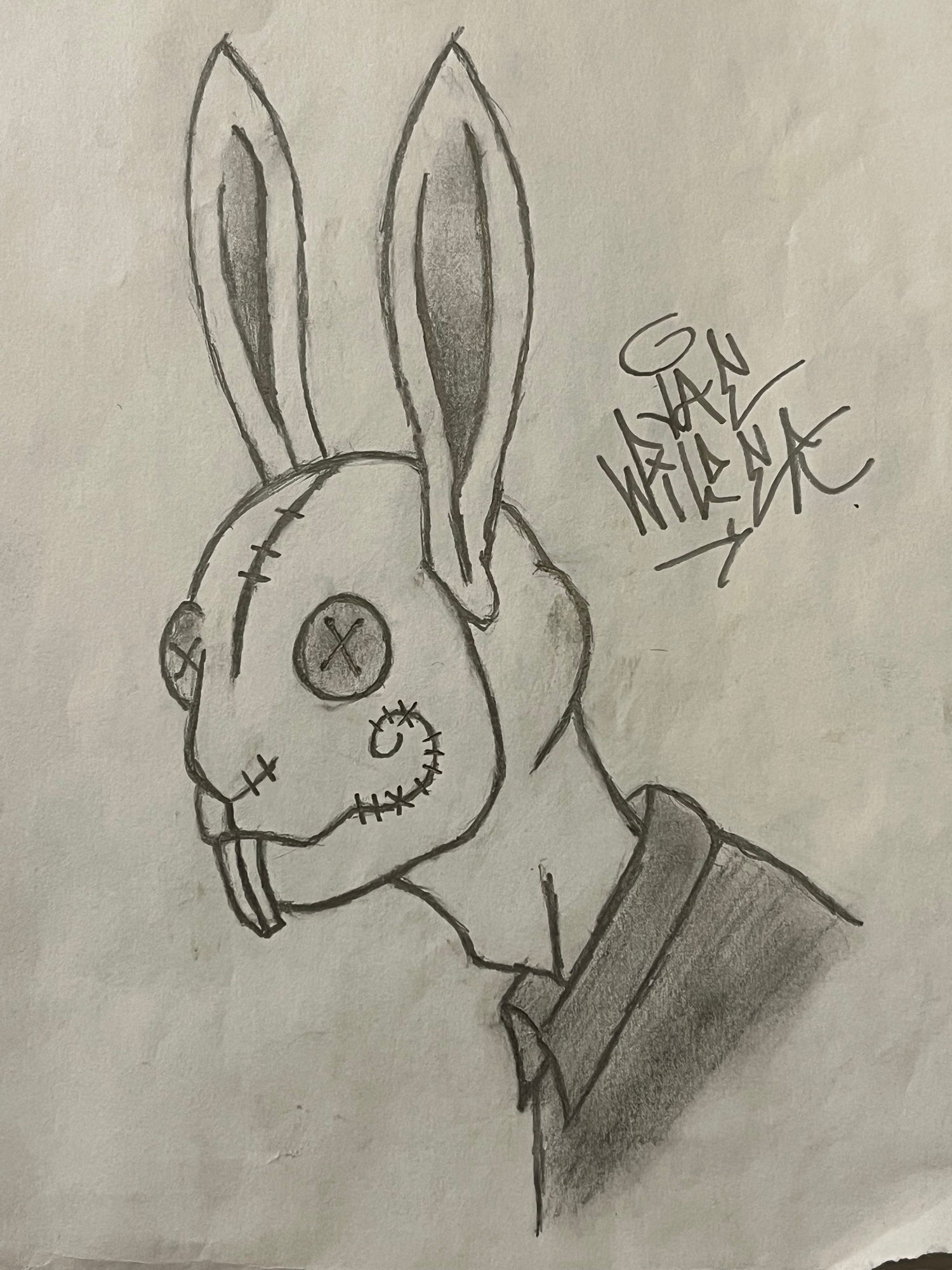 This drawing carries the weight of two lives that met in confinement — one still behind bars, one now walking free. The stitched rabbit mask represents the scars we carry, the parts of ourselves pieced together after being torn apart. Its hollow eyes and sewn smile speak to silent pain, survival, and the strange beauty that grows from suffering. The long ears stand alert, listening for freedom that feels close yet unreachable.