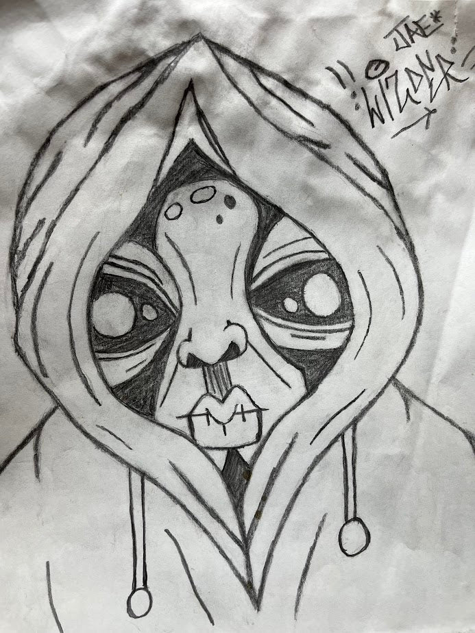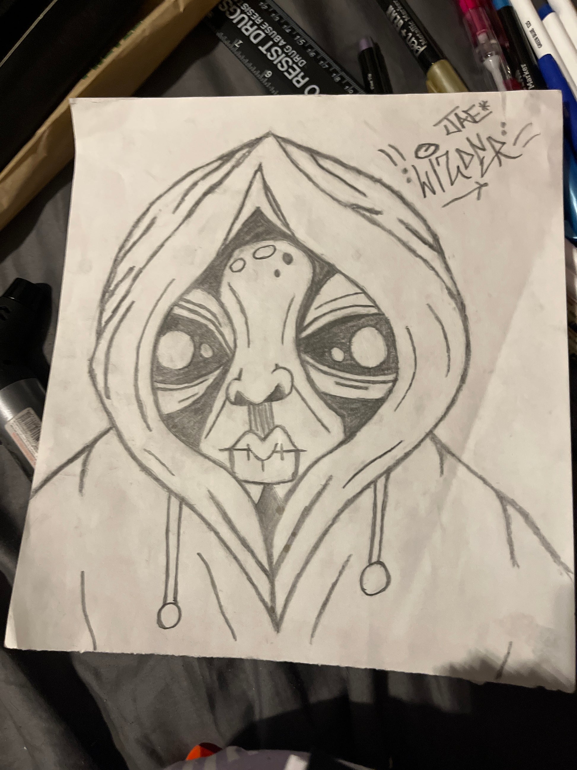 This drawing, titled “Bob,” portrays a mysterious hooded figure with striking, almost otherworldly features. The bold lines and dark shading create a powerful contrast that pulls the viewer in, leaving them to wonder about the story behind Bob’s intense gaze. With its eerie calm and alien-like expression, the piece captures a blend of curiosity and unease — as if Bob exists somewhere between worlds, watching and waiting in silence